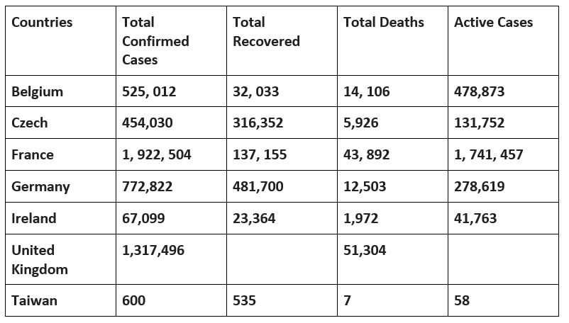 In performing this analysis, we made use of six countries who had flung back into a second Lockdown due to the surge of Covid19 as at November 2nd, 2020, Time: 7:07 am WAT (France, Belgium, Germany, UK, Czech & Ireland) as well as Taiwan who reported no covid19 case in 200 days as a October 28th, 2020.