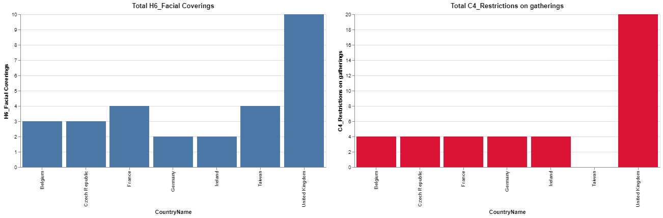 Restrictions on Gathering: The UK having the highest government policy measure with Taiwan at zero.